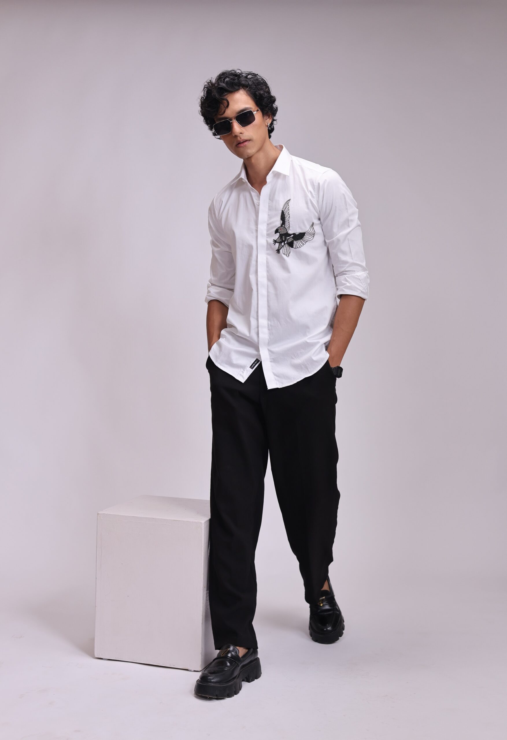 A crisp white shirt featuring a striking black embroidered bird or winged motif on the chest. The design provides a bold contrast and a contemporary, edgy look, suitable for semi-formal or stylish casual wear.