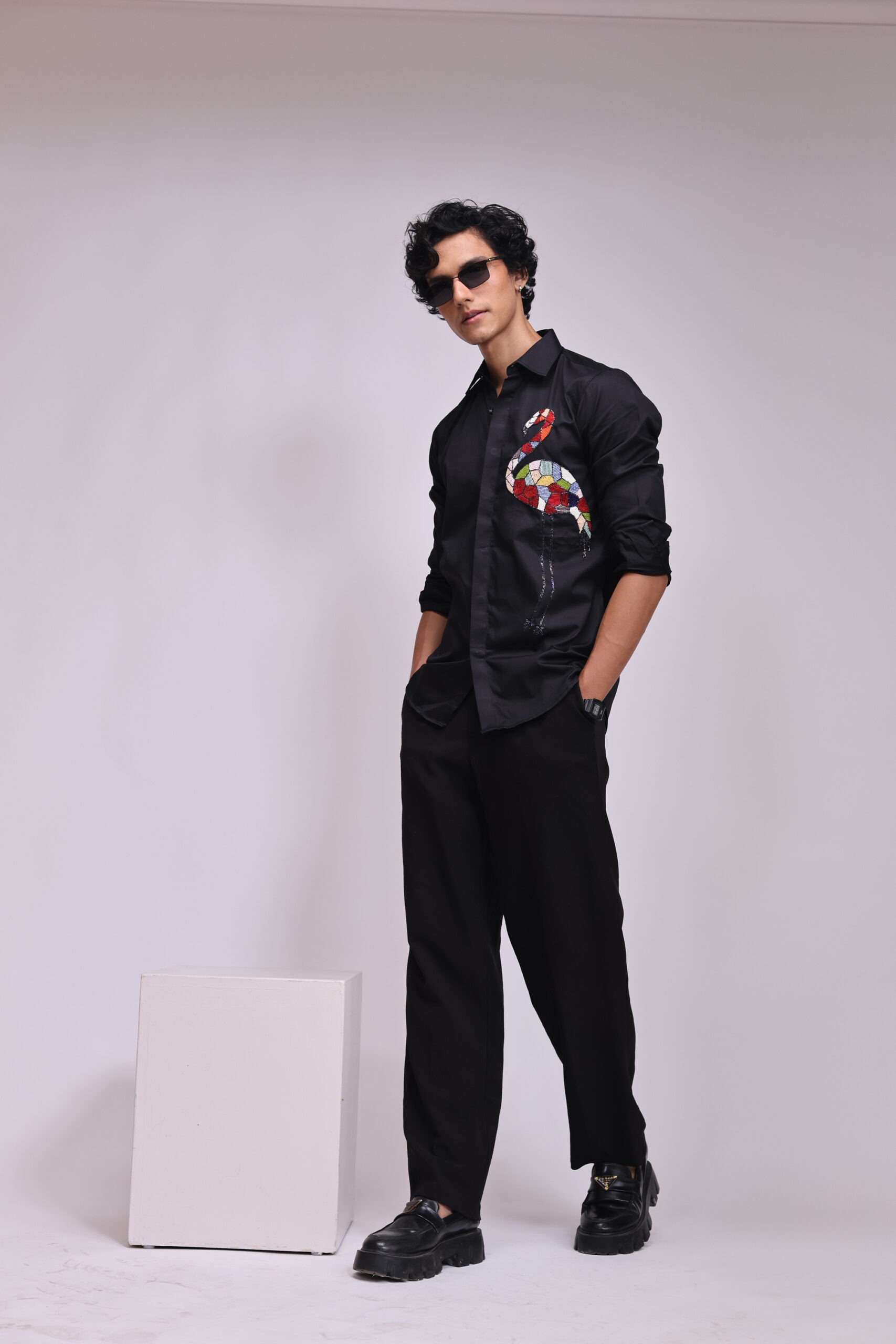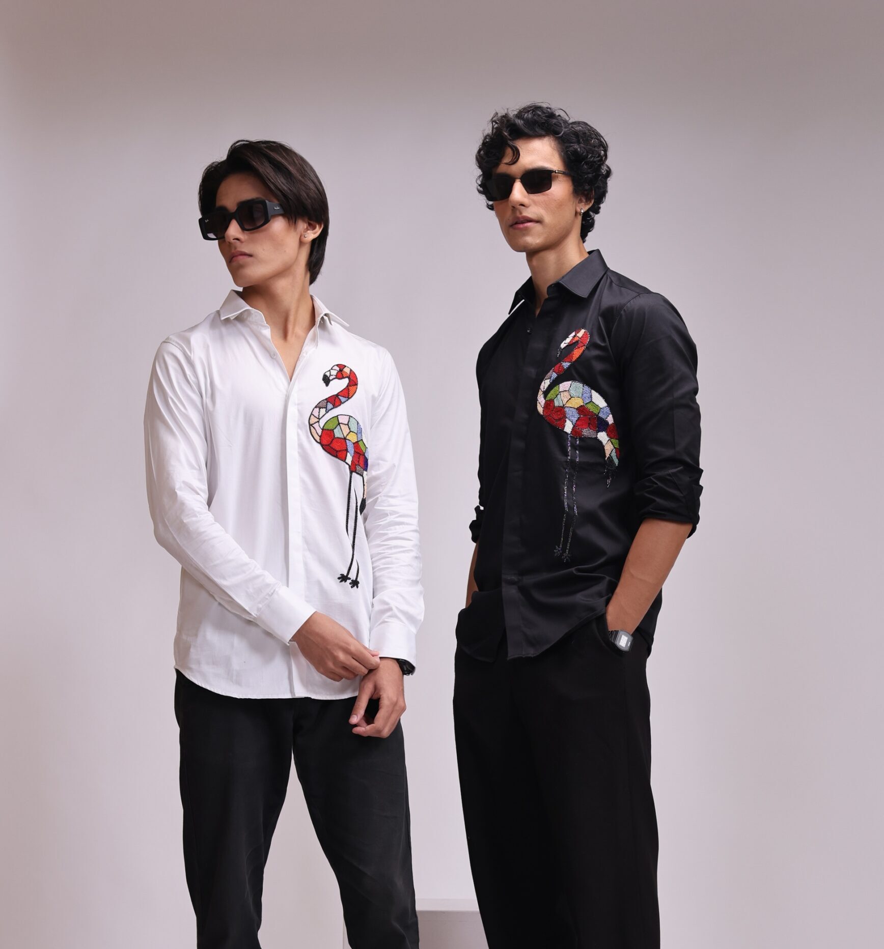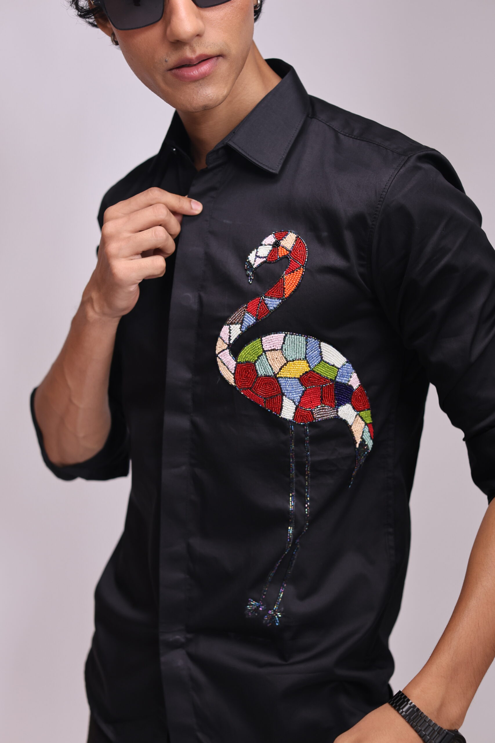 A smooth black shirt featuring a vibrant mosaic flamingo on the chest, with its body formed by a pattern of colorful, multi-hued beads. The bright, detailed artistry provides a tropical, eye-catching contrast to the dark fabric.