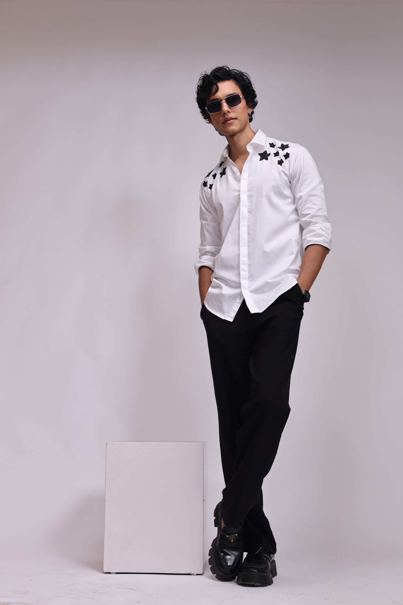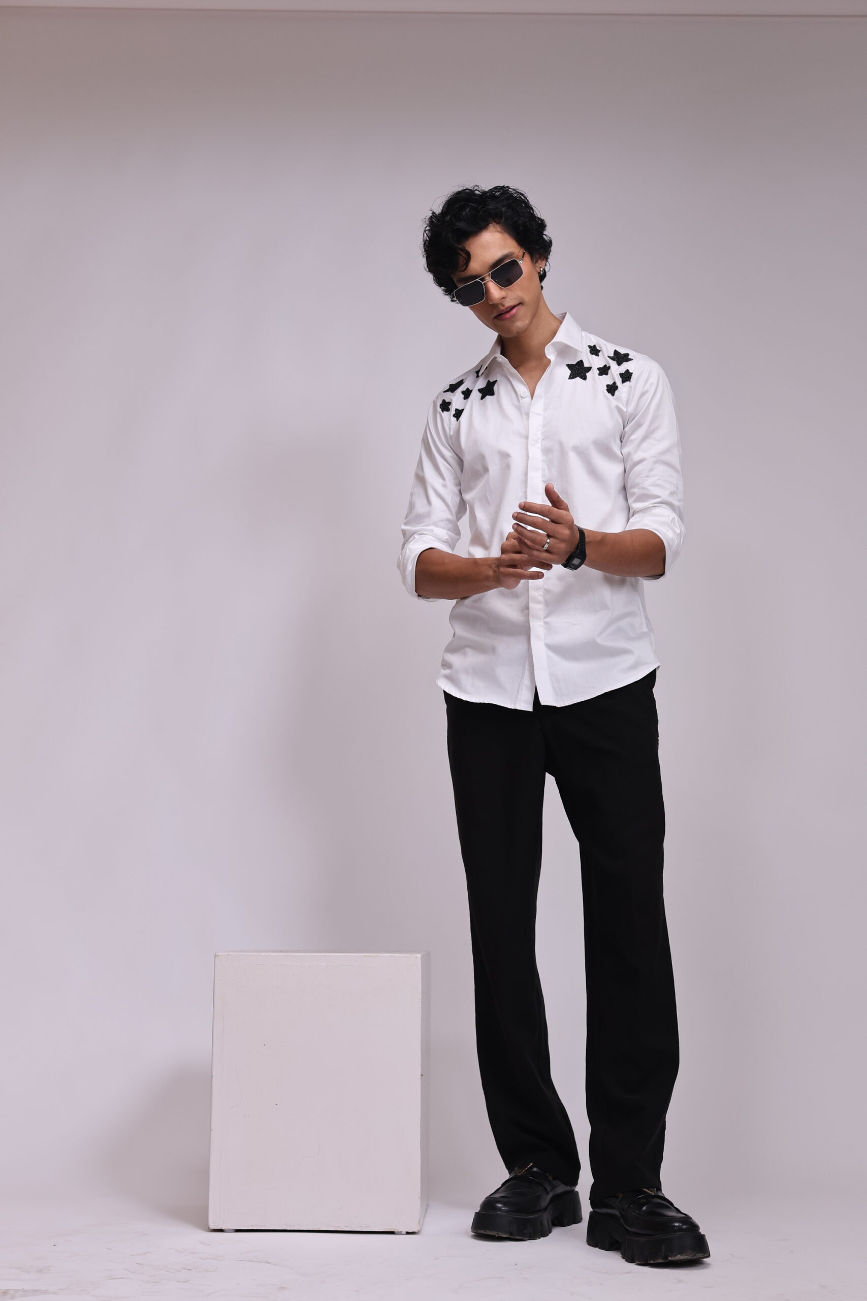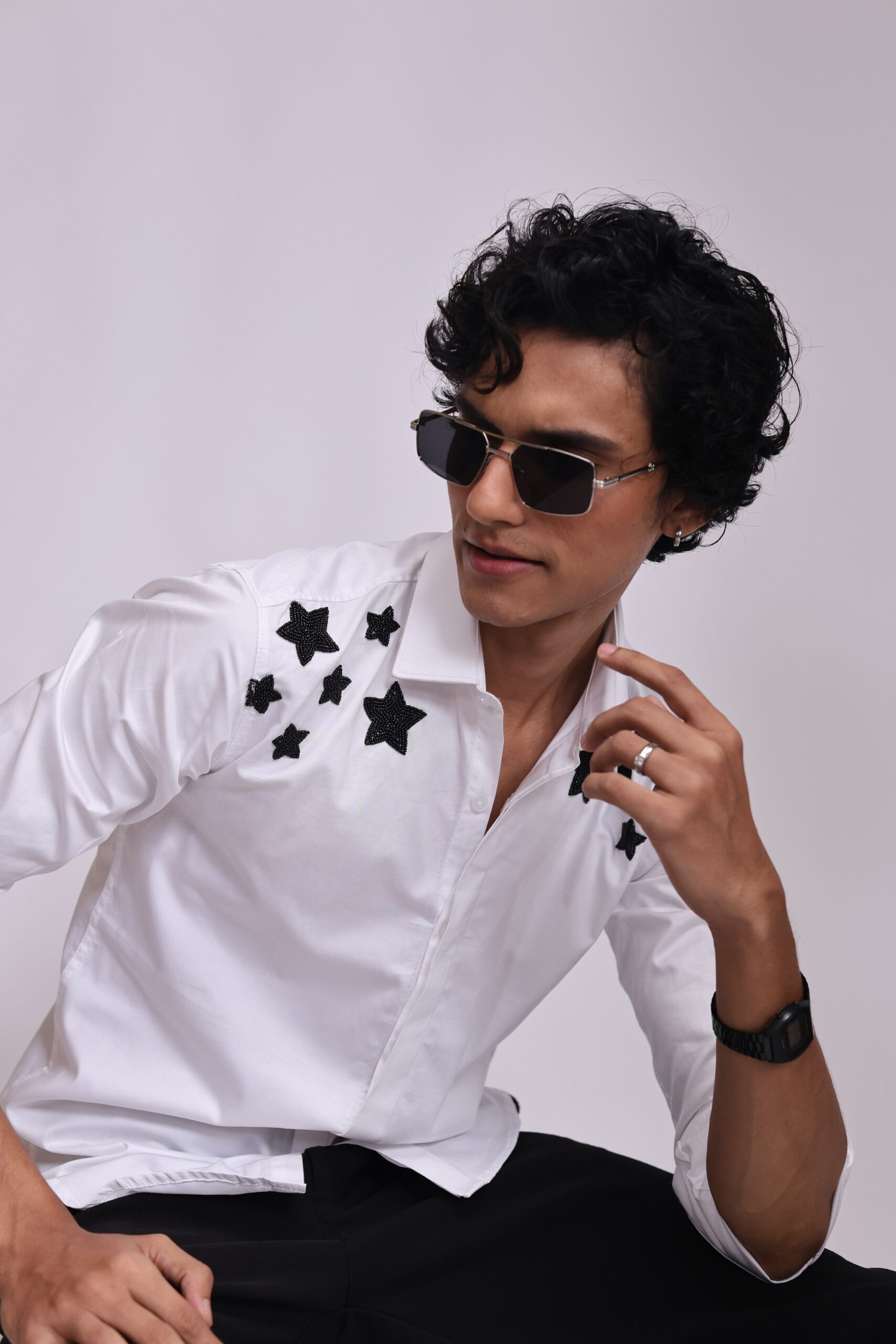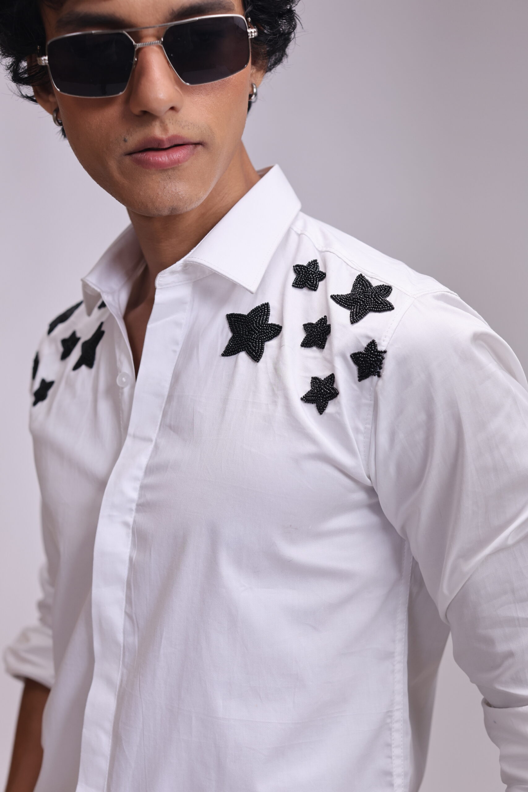 A smooth white shirt embellished with scattered black beaded stars of various sizes across the shoulder area. The design gives a glamorous, celestial, and rock-and-roll-inspired detail to the classic white base.