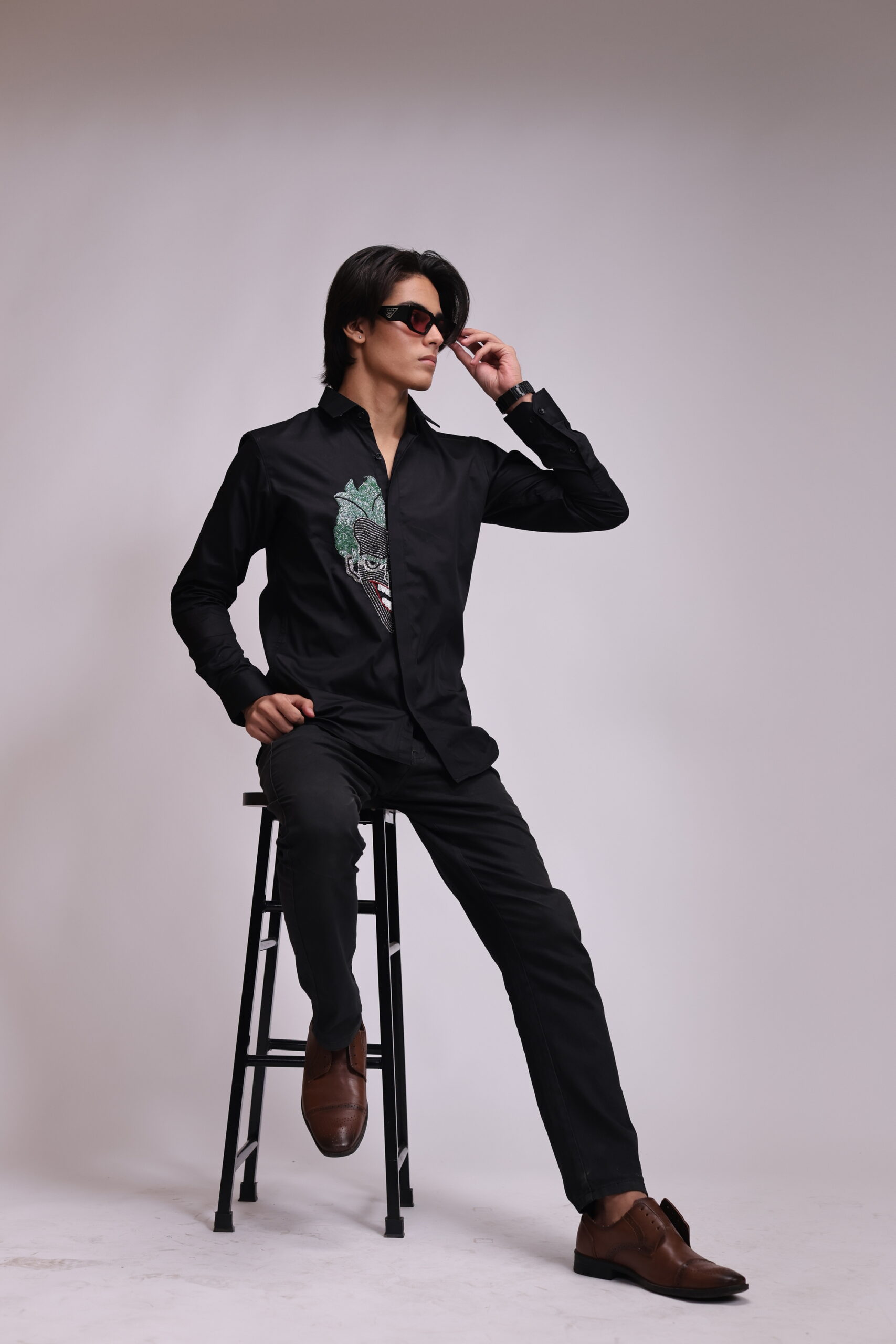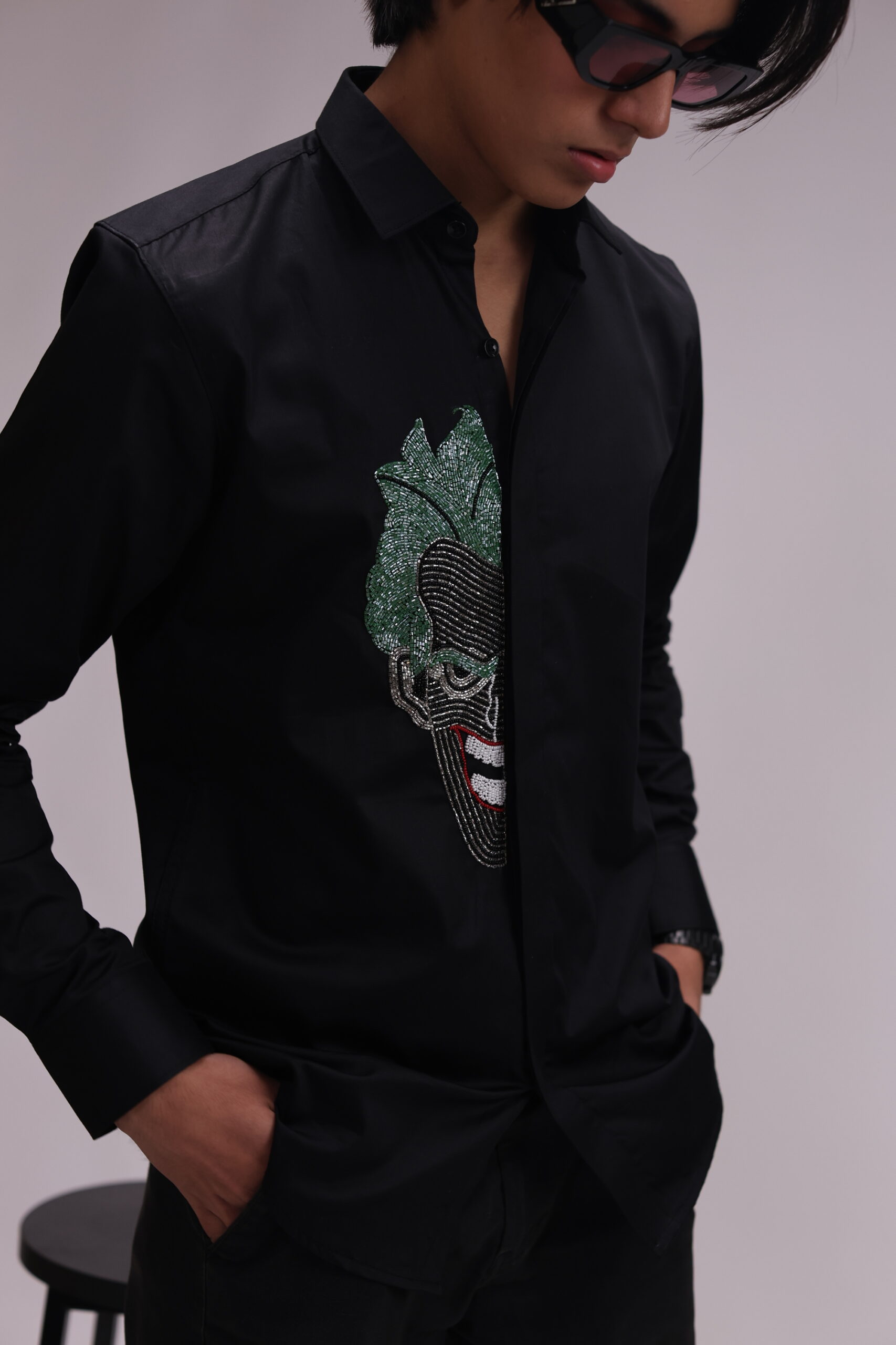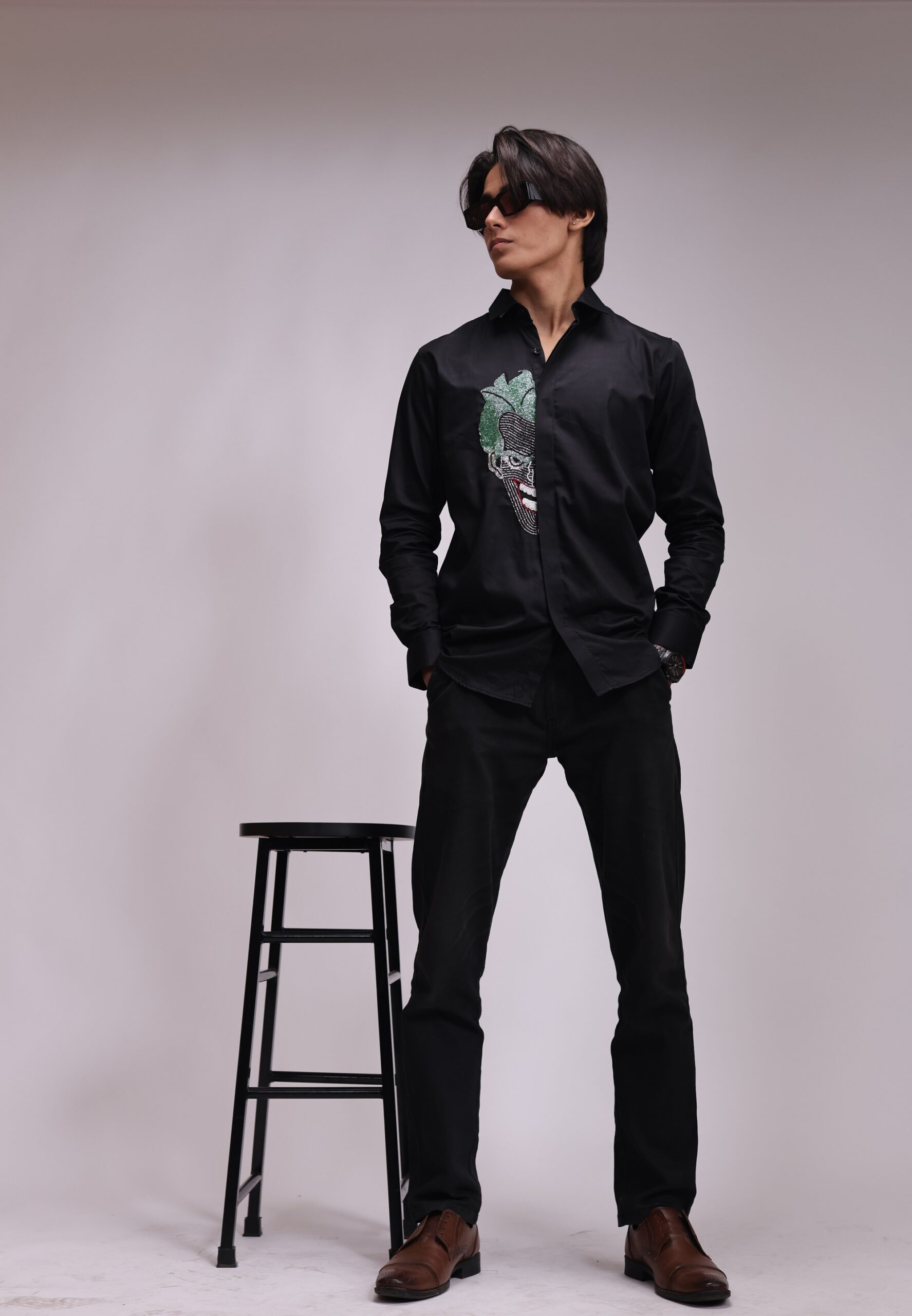 A sleek black shirt featuring a bold, beaded rendition of the Joker’s face on the chest, complete with bright green hair and a red-lipped smile. The detailed, colorful beadwork contrasts dramatically with the dark material for a statement look.