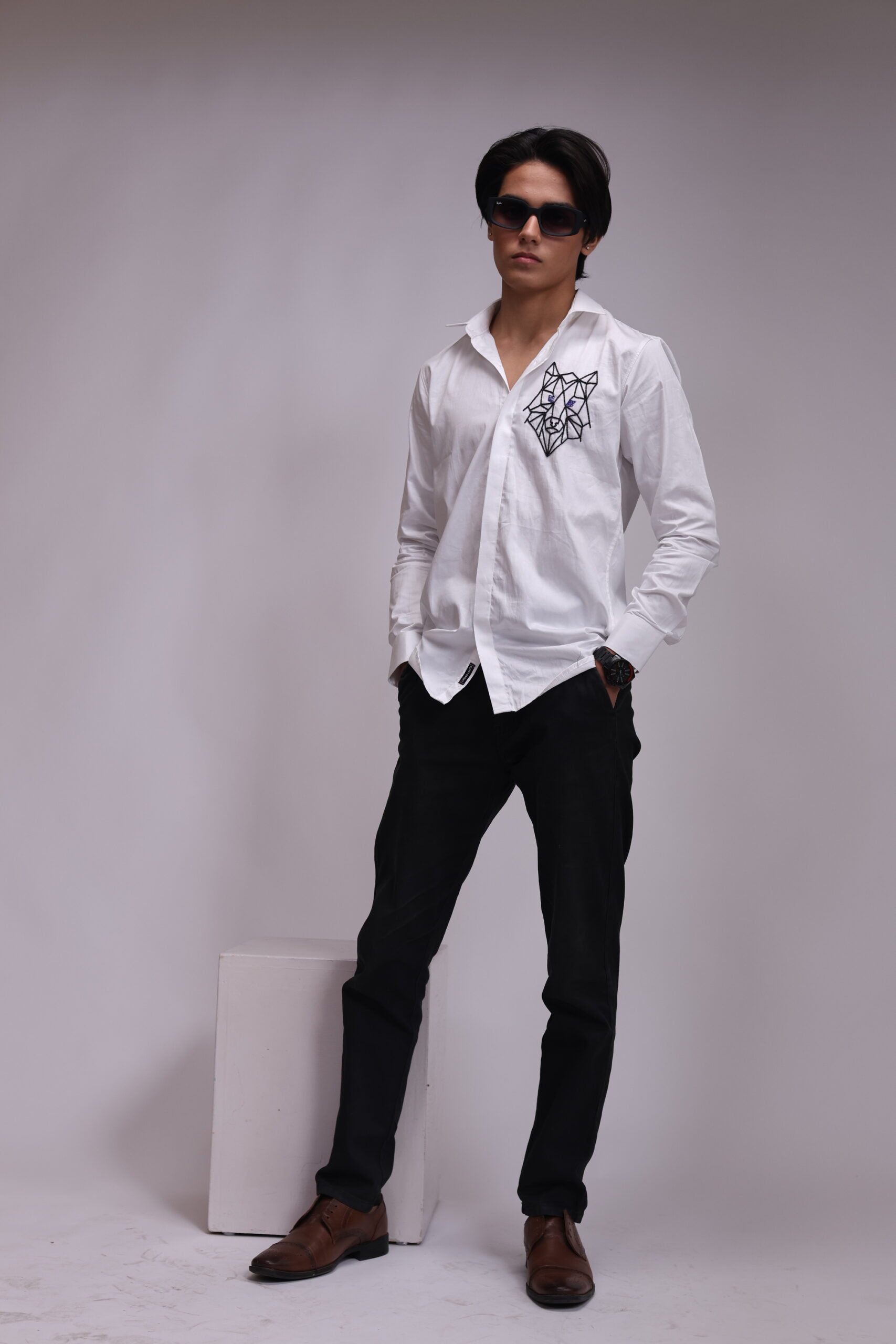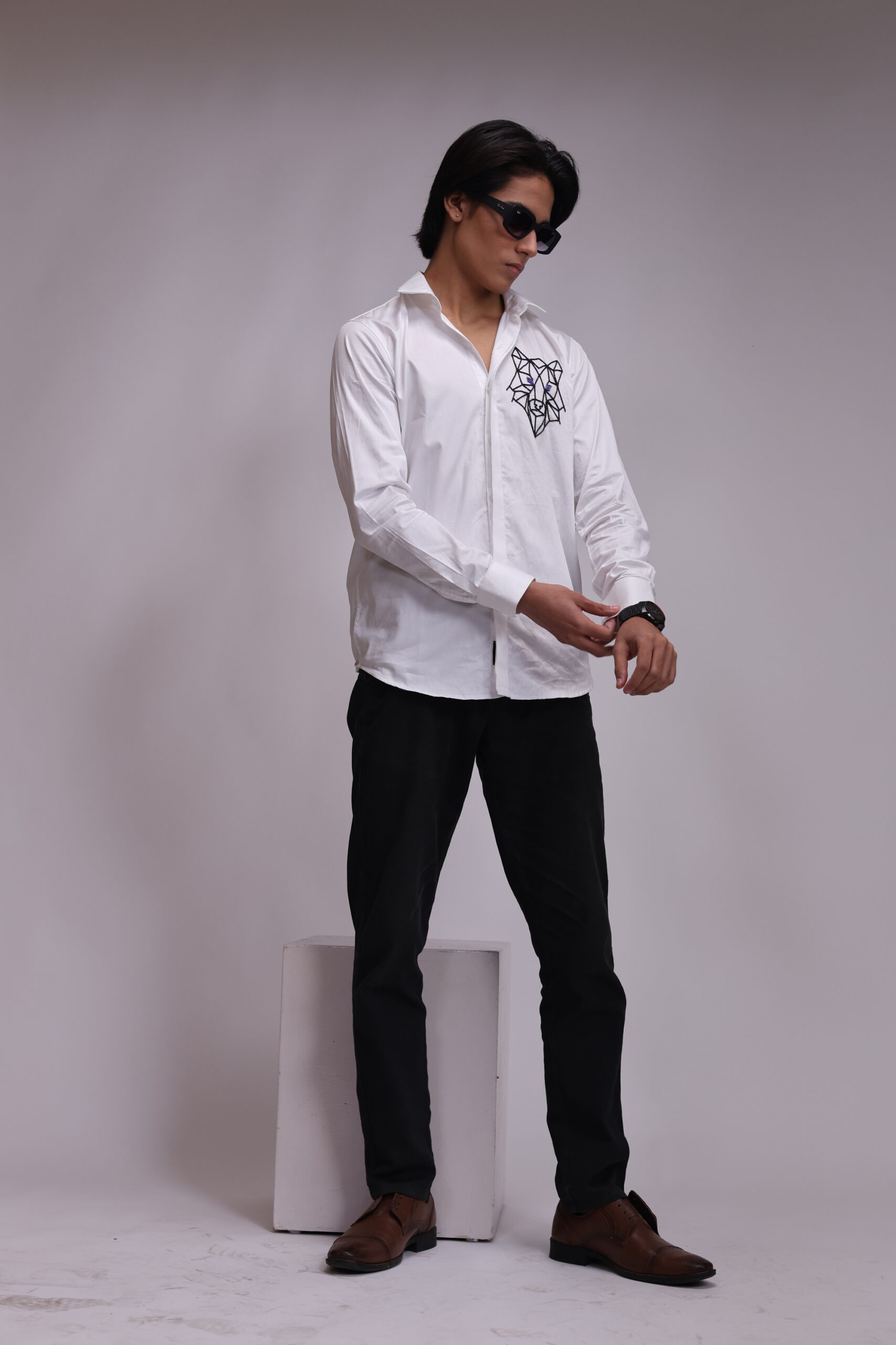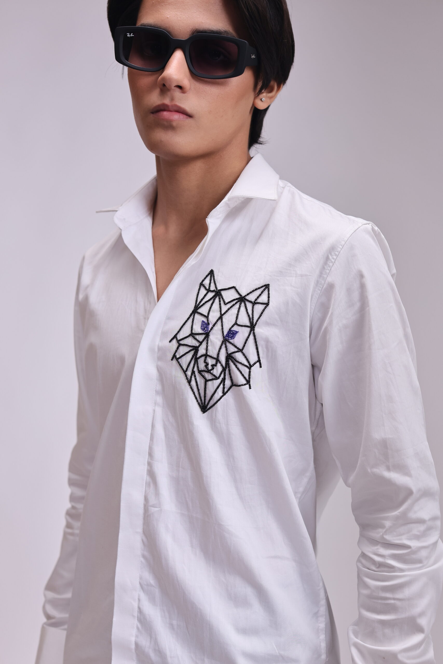 A white shirt showcasing a striking geometric wolf head design on the chest, outlined in black embroidery with subtle blue accents for the eyes. The polygonal style gives the animal motif a sharp, modern, and stylized look.